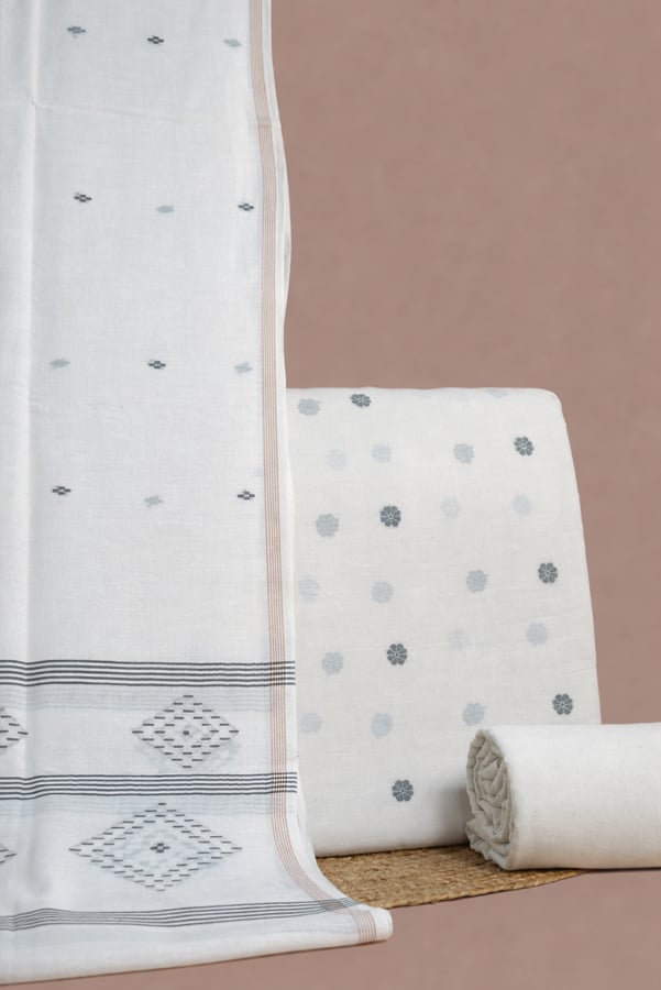 White – 3Pc Handloom Cotton Dupatta with Woven Motif Top & Handloom Soft Cotton Bottom Fabric Set