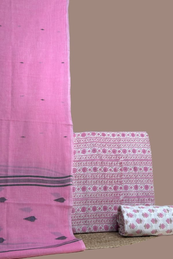 2.5mtr Each – Handloom Soft Cotton Dupatta with Blockprint Soft Cotton Top and Bottom Fabric Set