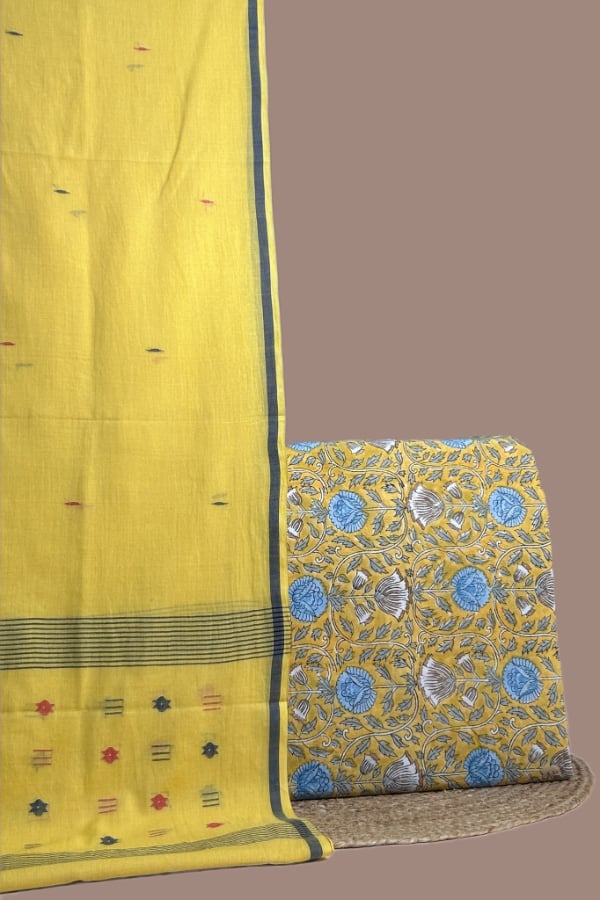 Yellow – 2pc Handloom Cotton Dupatta and Blockprinted Soft Cotton Top Set