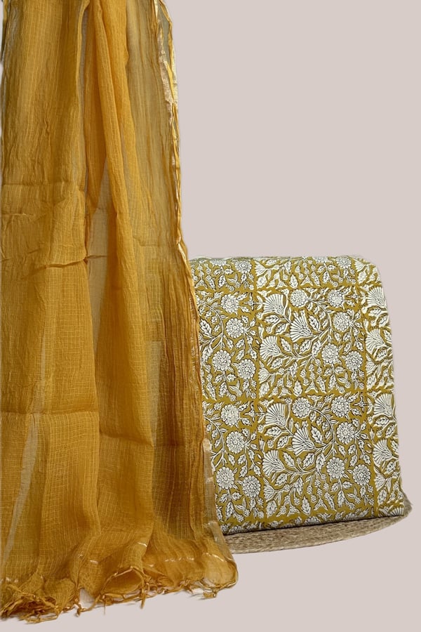Yellow – 2pc Kota Doria Dupatta and Bagru HandBlock Pure Cotton Set