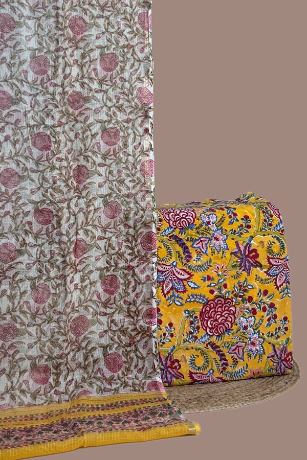 Yellow – 2pc Kota Doria Dupatta and Pure Soft Cotton Blockprint Top Fabric Set