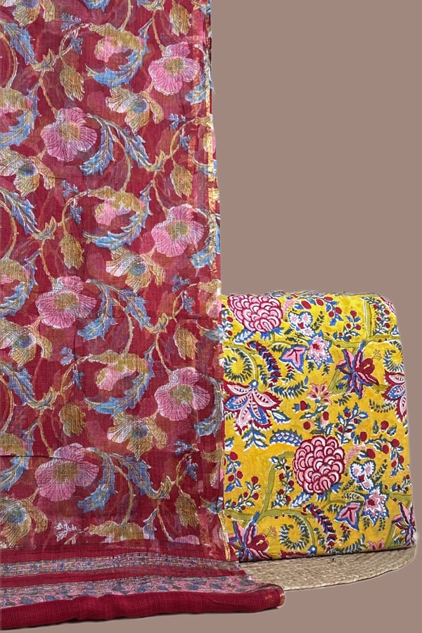 Yellow - 2pc Kota Doria Dupatta and Pure Soft Cotton Blockprint Top Fabric Set