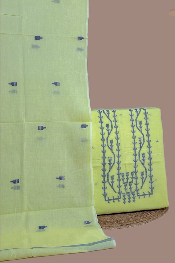 2Pc Set (3mt Top + 2.5mt Bottom) Handloom Embroidered Neck Design Soft Cotton Top(3m) Bottom(2.5m) Fabric Set