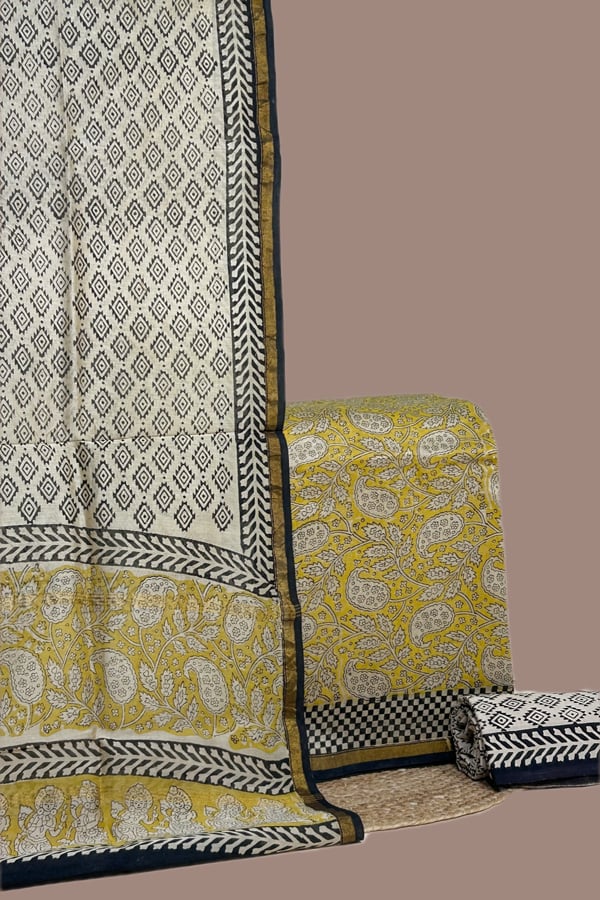 Yellow – 3pc Chanderi Silk Dupatta and Top Fabric with Cotton Blockprint Bottom Fabric Set