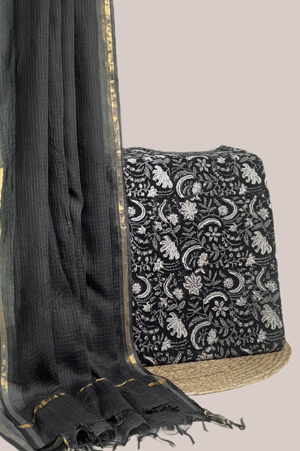 Black – 2pc Kota Doria Dupatta and Pure Soft Cotton Blockprint Top Fabric Set