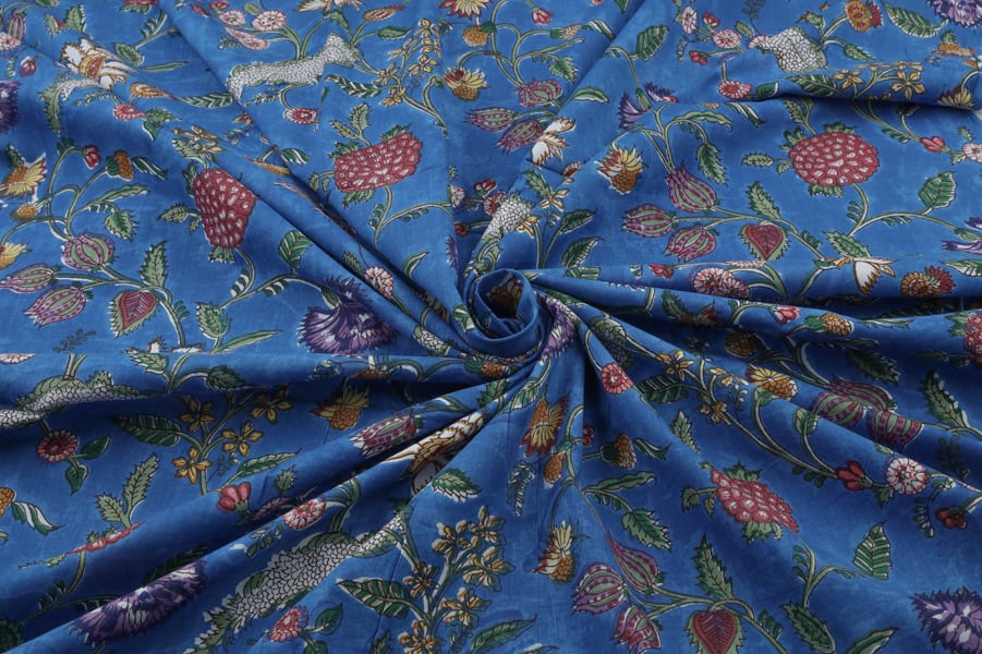 Blue Floral Handblock Printed 100% Pure Soft Cotton Fabric