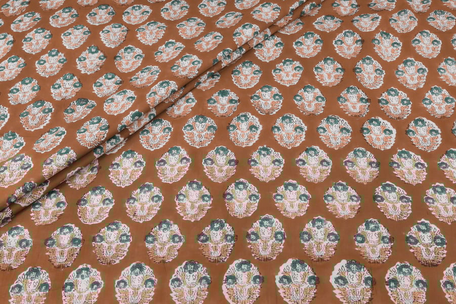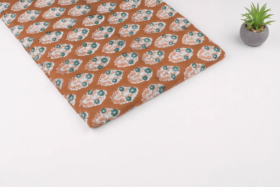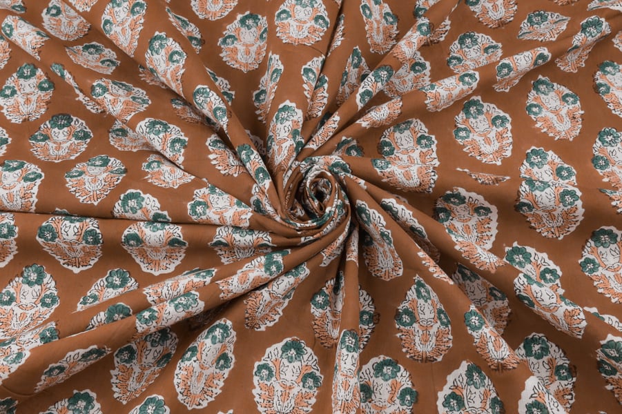 Ginger Brown Floral Handblock Printed 100% Pure Soft Cotton Fabric