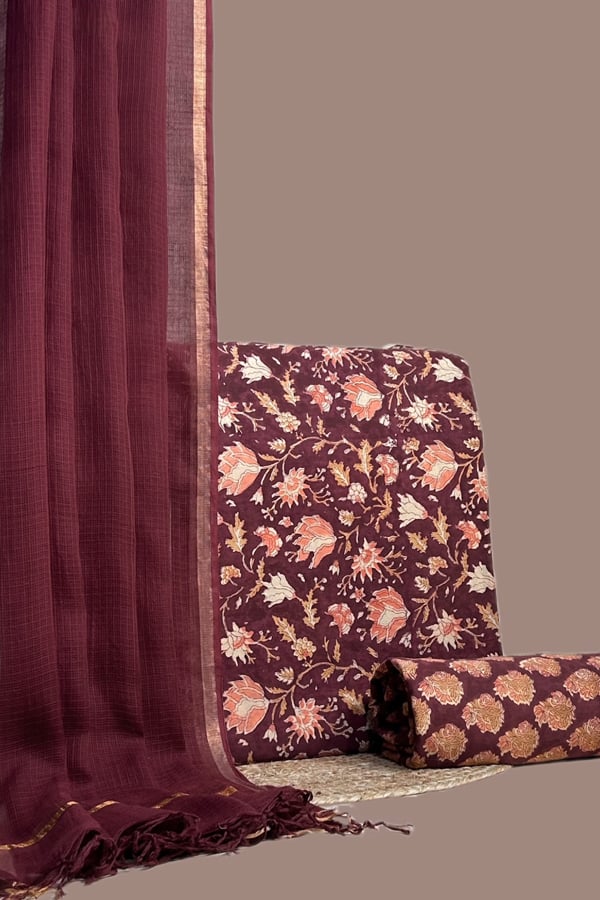 Maroon – 3pc Kota Doria Dupatta with Blockprint Pure Soft Cotton Top & Bottom Set