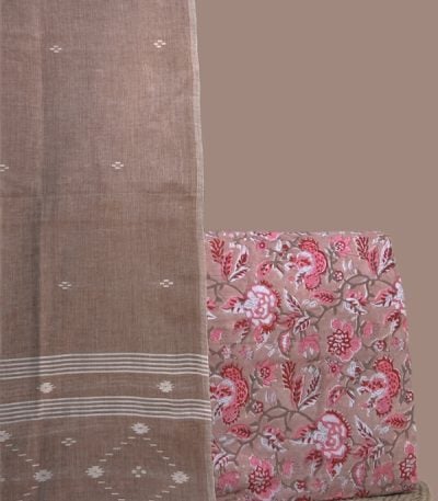 Beige – 3pc Handloom Soft Cotton Dupatta with Blockprint Cotton Top & Bottom Set