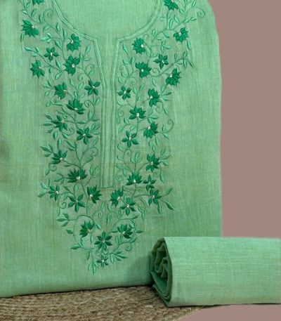 Green – 2Pc Handloom Embroidered Neck Design Soft Cotton Top(3m) Bottom(2.5m) Fabric Set