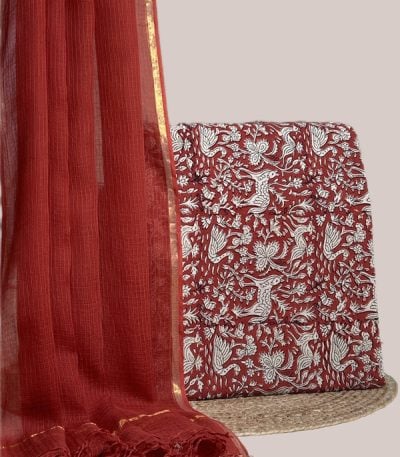 Red – 2pc Kota Doria Dupatta and Pure Soft Cotton Blockprint Top Fabric Set