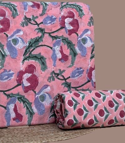 Pink – 2pc Pure Soft Cotton Blockprinted Top and Bottom Fabric Set