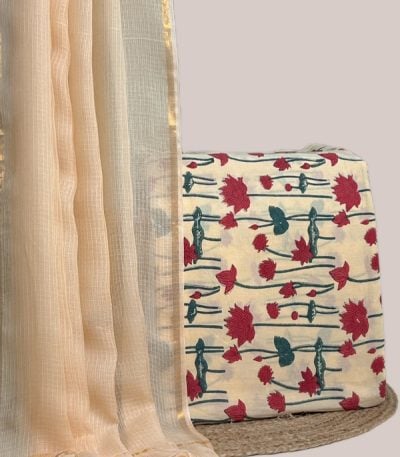 Beige – 2pc Kota Doria Dupatta and Pure Soft Cotton Blockprint Top Fabric Set
