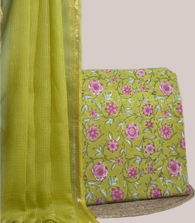 Green – 2pc Kota Doria Dupatta and Pure Soft Cotton Blockprint Top Fabric Set