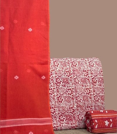 Red – 3pc Handloom Soft Cotton Dupatta with Pure Soft Cotton Top & Bottom Set