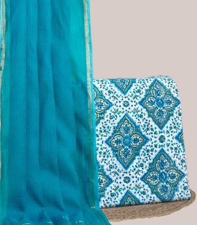 White – 2pc Kota Doria Dupatta and Pure Soft Cotton Blockprint Top Fabric Set